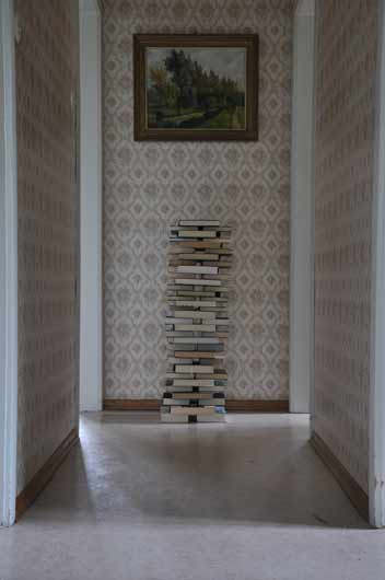 An absent person is represented by a column of books in his home. The character of the person can be reconstructed through perspective, materials and composition.