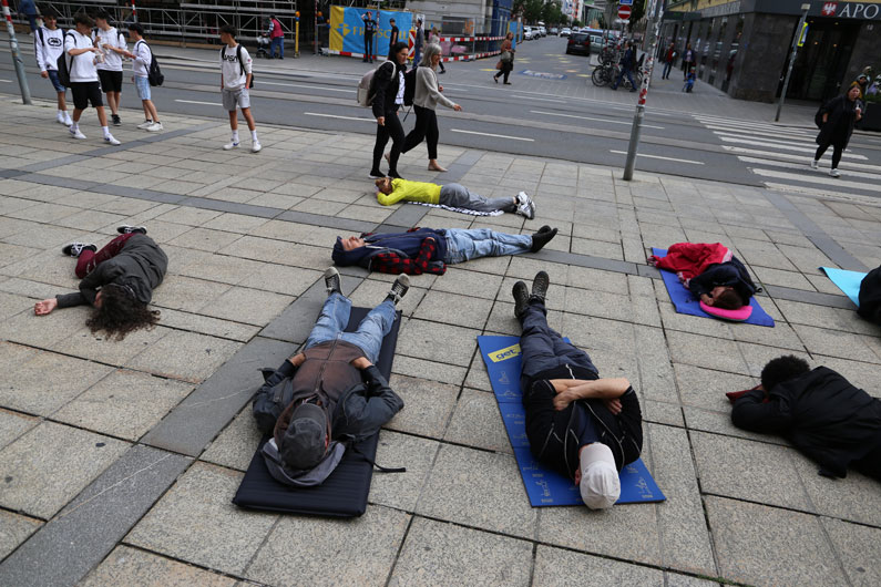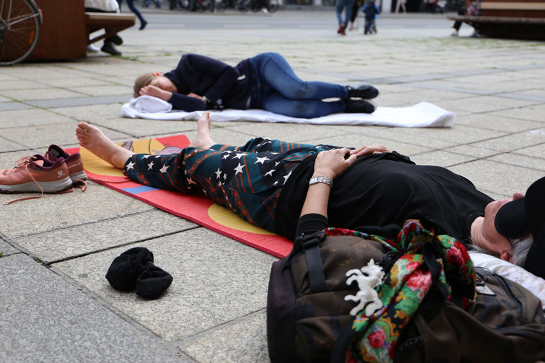 In June 2022, the idea of sleep as protest and resistance was realised as a performance with 20 Tyrolean art and cultural actors in Innsbruck as part of the TKI open 22_liegen. The documentation of the action, the opinions and comments of the people involved in the project form the basis of an exhibition that took place in December 2022.