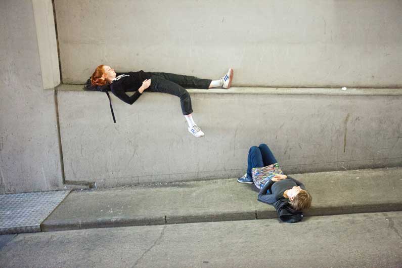 In the course of STWST 48×4 and the Ars Electronica Festival, small sleep interventions were carried out in public places under the title „Rough Sleep“. Katharina Brandl, Violeta Ivanova and Karla Woess drew attention to the constant acceleration of society. Sleep is seen as a form of resistance against an increasingly competitive society and individuals focused only on self-optimisation. – In addition to the performance, exhibitions and photo books are being produced under the title „Nullstellung“.