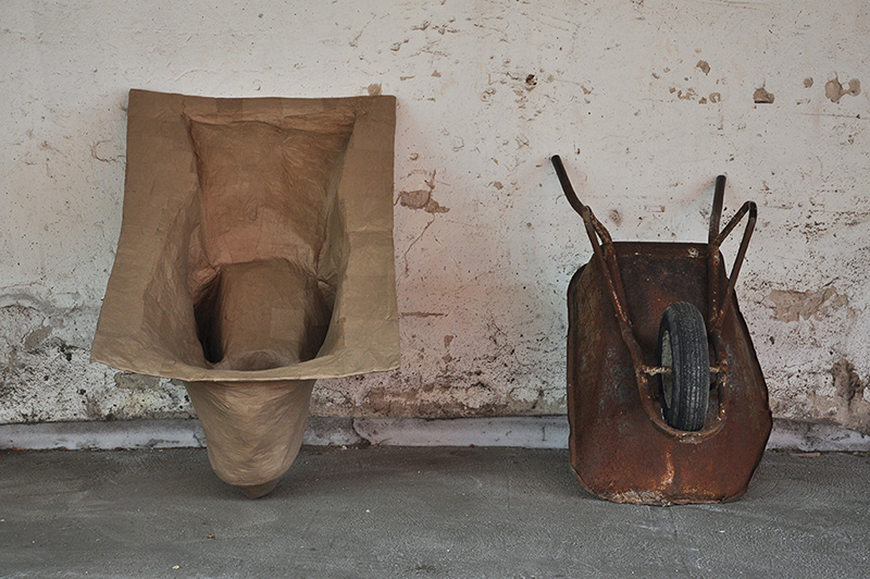 The shape of a used wheelbarrow was built using papier mâché and brings to mind packaging materials. The object represents the negative space of the wheelbarrow. The original object stands beside the paper form.