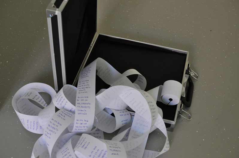 Datum, Uhrzeit, Breiten- und Längengrade sowie die Geschwindigkeit halte ich während des Unterwegsseins auf einem Endlospapier fest. Die Daten sind jedoch schon zum Zeitpunkt des Niederschreibens nicht mehr aktuell und ein neuer Datensatz beginnt. Die Verortung in Raum und Zeit ist unmöglich und so ist die Reise eine absurde Tat, bei der nicht das Erleben sondern ihre Dokumentation im Mittelpunkt steht.